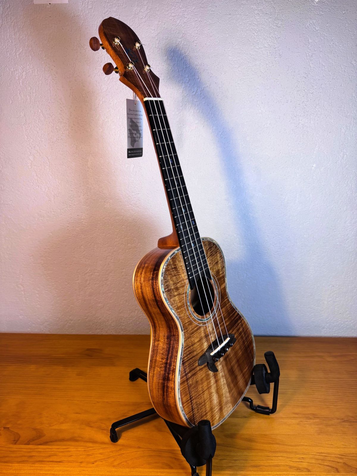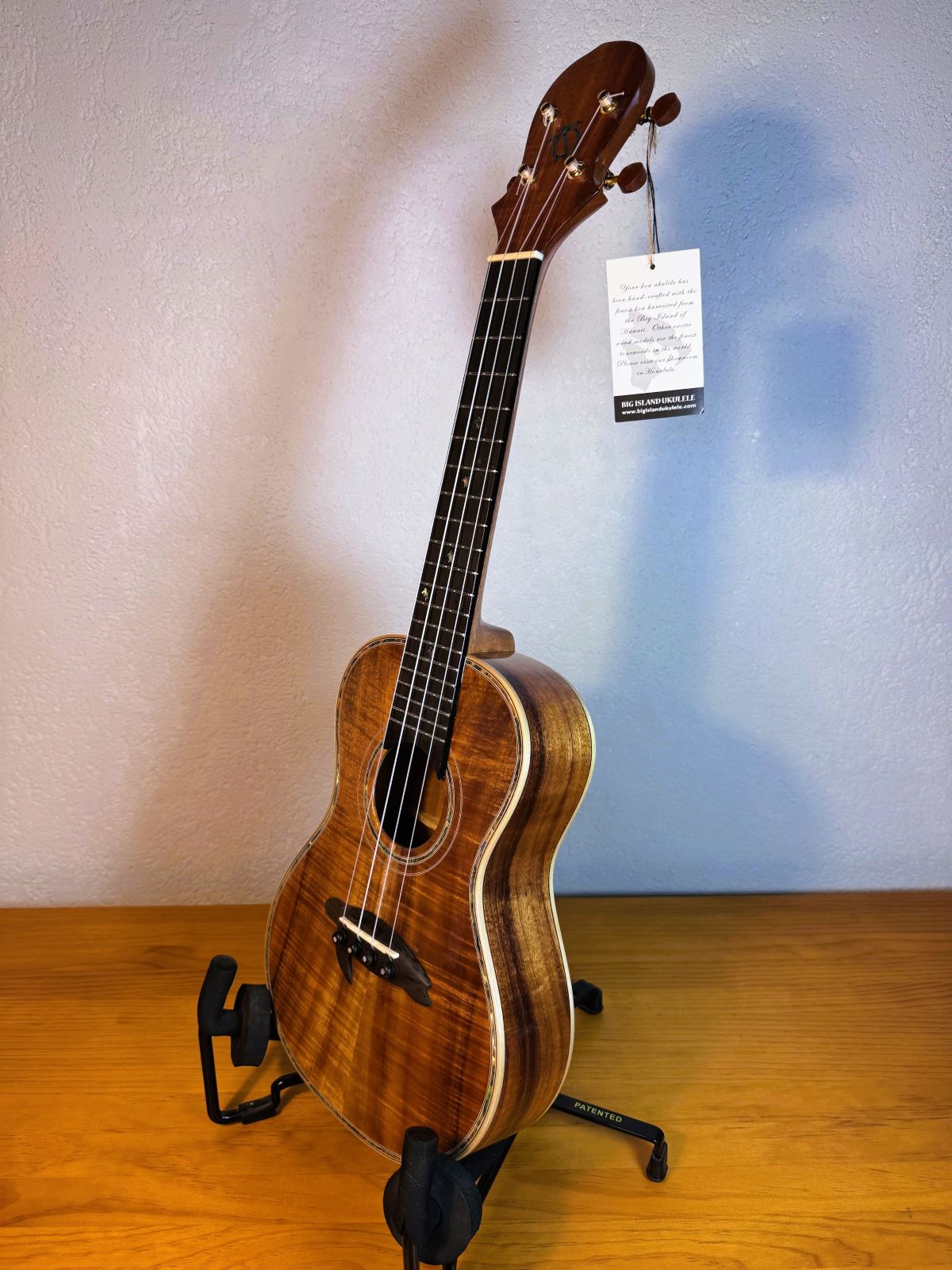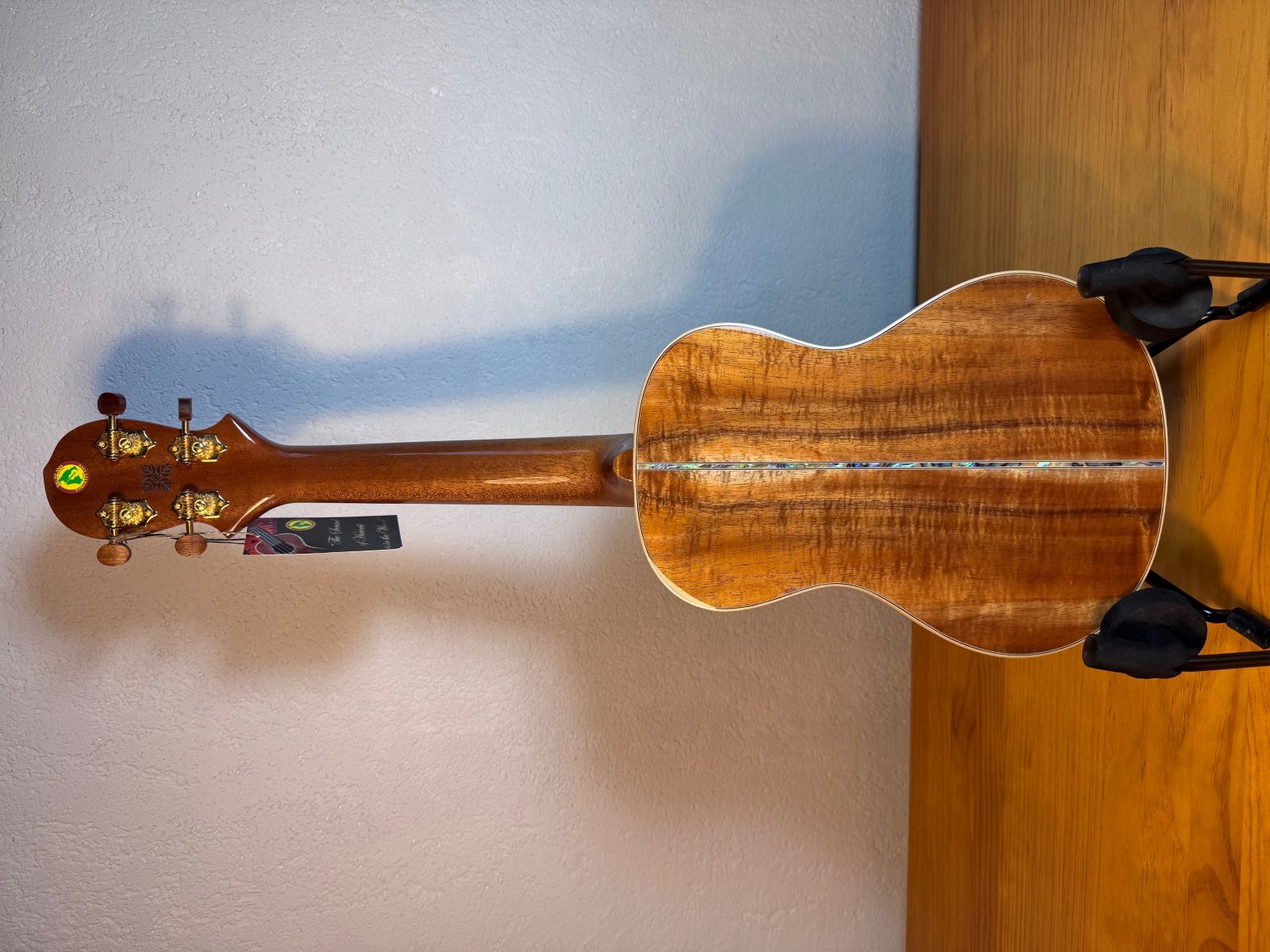 ''Honu'' ist das hawaiianische Wort für Schildkröte und wie die Honu-Ukulele ist die hawaiianische Seeschildkröte eine Kreatur von Emotion, Anmut und Langlebigkeit. Das Spielen der Honu-Ukulele versetzt Sie an die Küsten der hawaiianischen Inseln, wo Seeschildkröten zur süßen Musik der Ukulele umher schwimmen. Das Koa-Holz für diese Ukulelen wird in Hawaii geerntet, geschnitten und getrocknet. Die Honu Deluxe Ukulelen sind mit einer Schalloch-Rosette und Einlagen aus Abalone verziert. Stegeinlagen und Sattel bestehen aus Knochen.