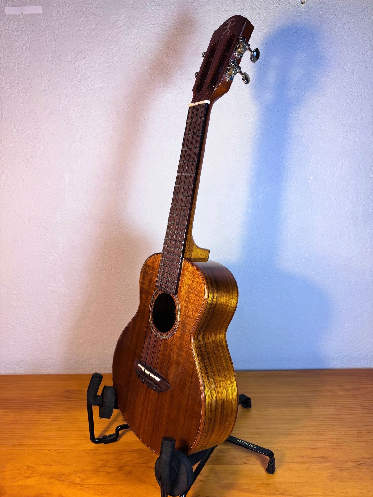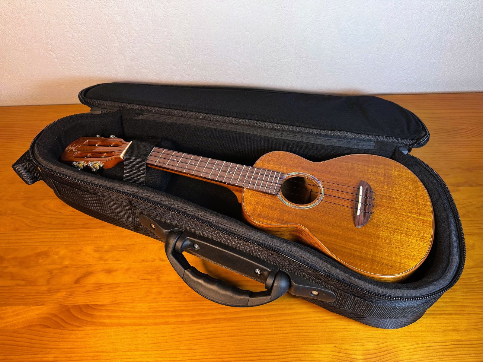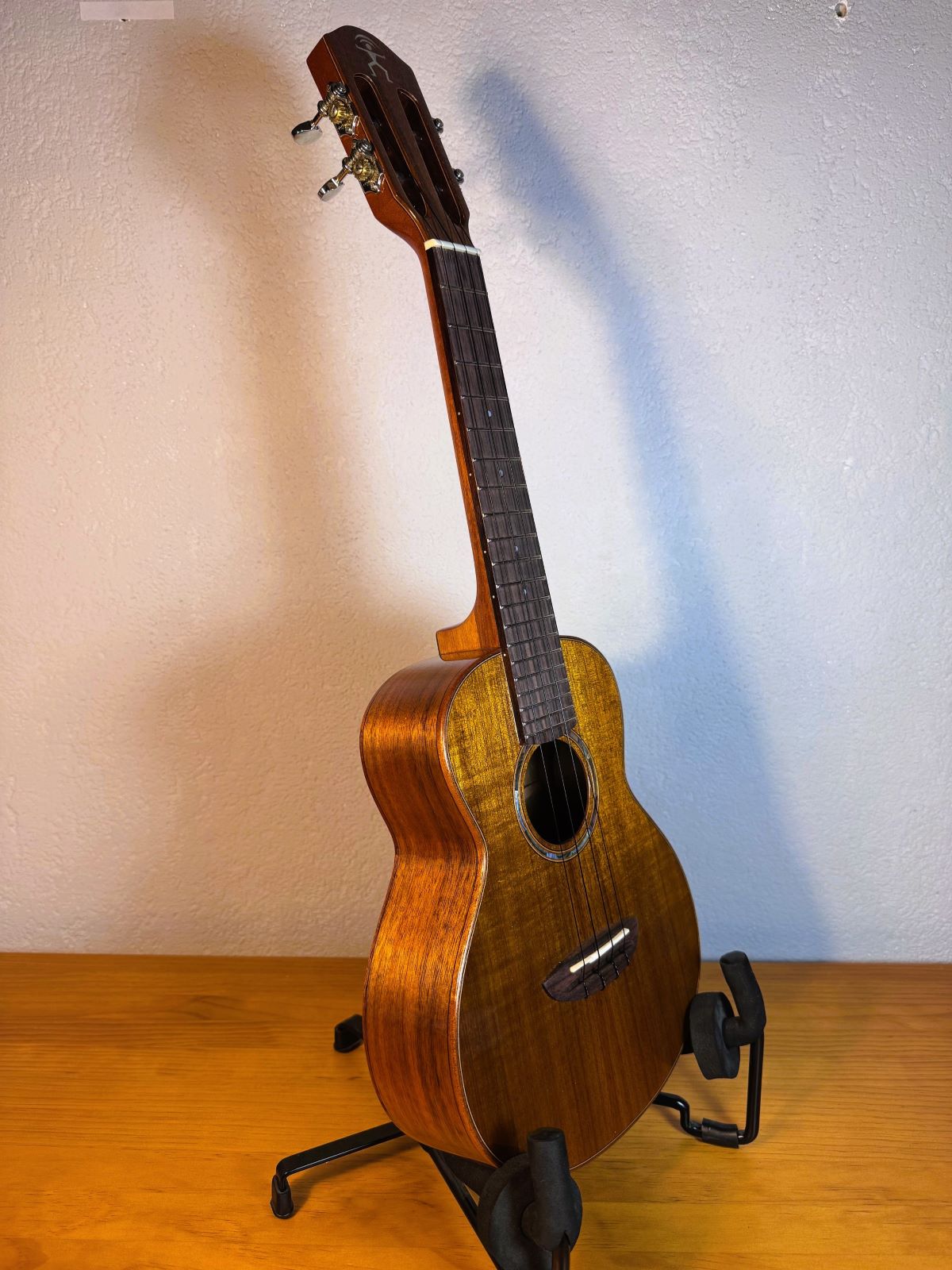 Die aNueNue AKK2 Konzert Ukulele ist aus massivem Hawaiian-Koa gefertigt. Die Ukulele hat einen ausgewogenen, süßen Klang mit satten Obertönen. Details wie die Holz-Abalone Rosette, das geewölbte Griffbrett, das Mahagoni Binding und die geschlitzte Kopfplatte runden die Ukulele ab. Geliefert wird die Ukulele in einem hochwertigen Gigbag.