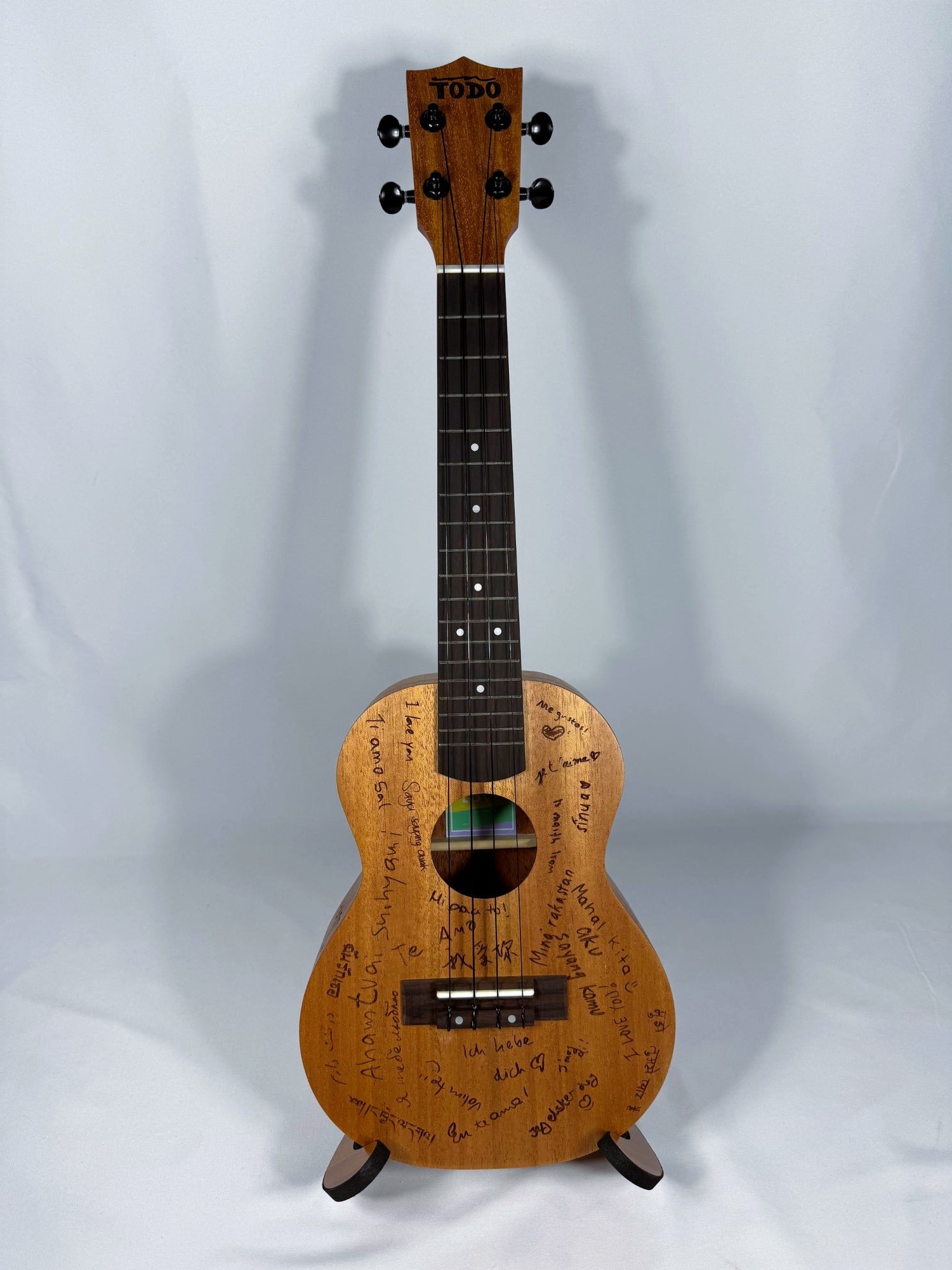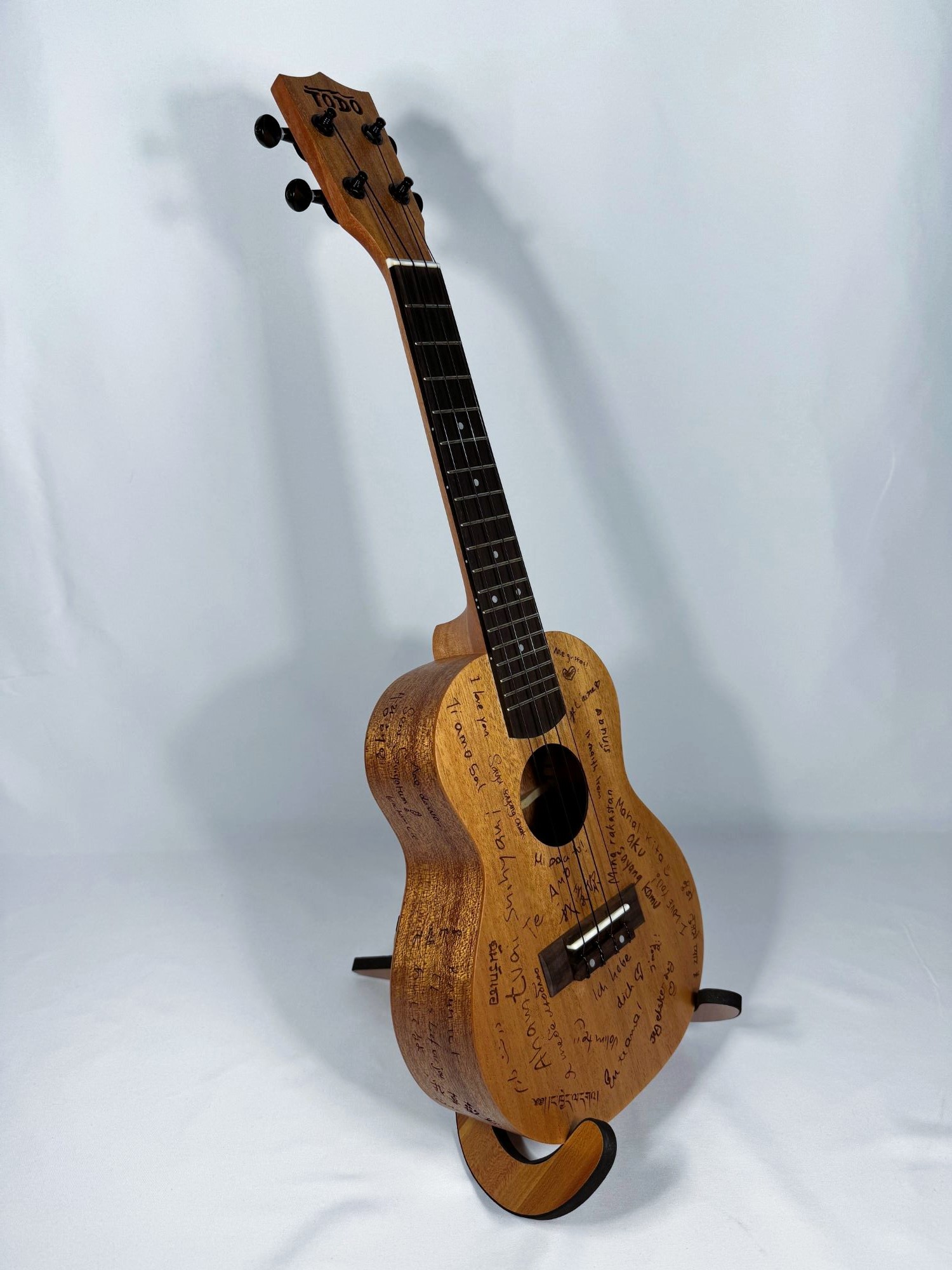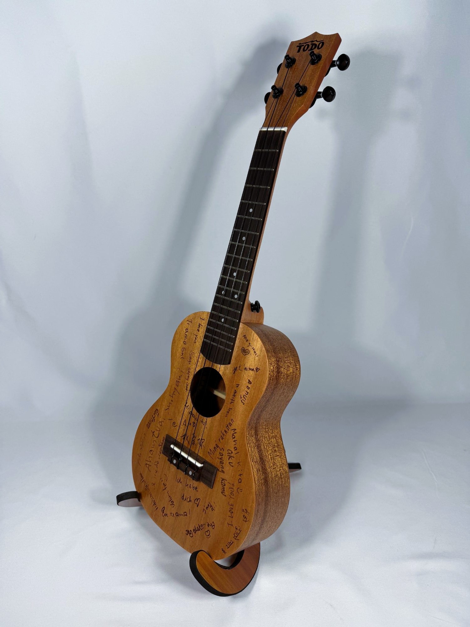 Verschiedene Länder - Verschiedene Sprachen - Verschiedene Kulturen - EINE WELT. Die Love-Ukulele hat ein ganz besonderes Design - auf ihr ist "Ich liebe dich" in 26 verschiedenen Sprachen eingraviert. Jede Garvur steht für eine andere Liebesgeschichte welche die Grenzen dieser Welt überwinden.