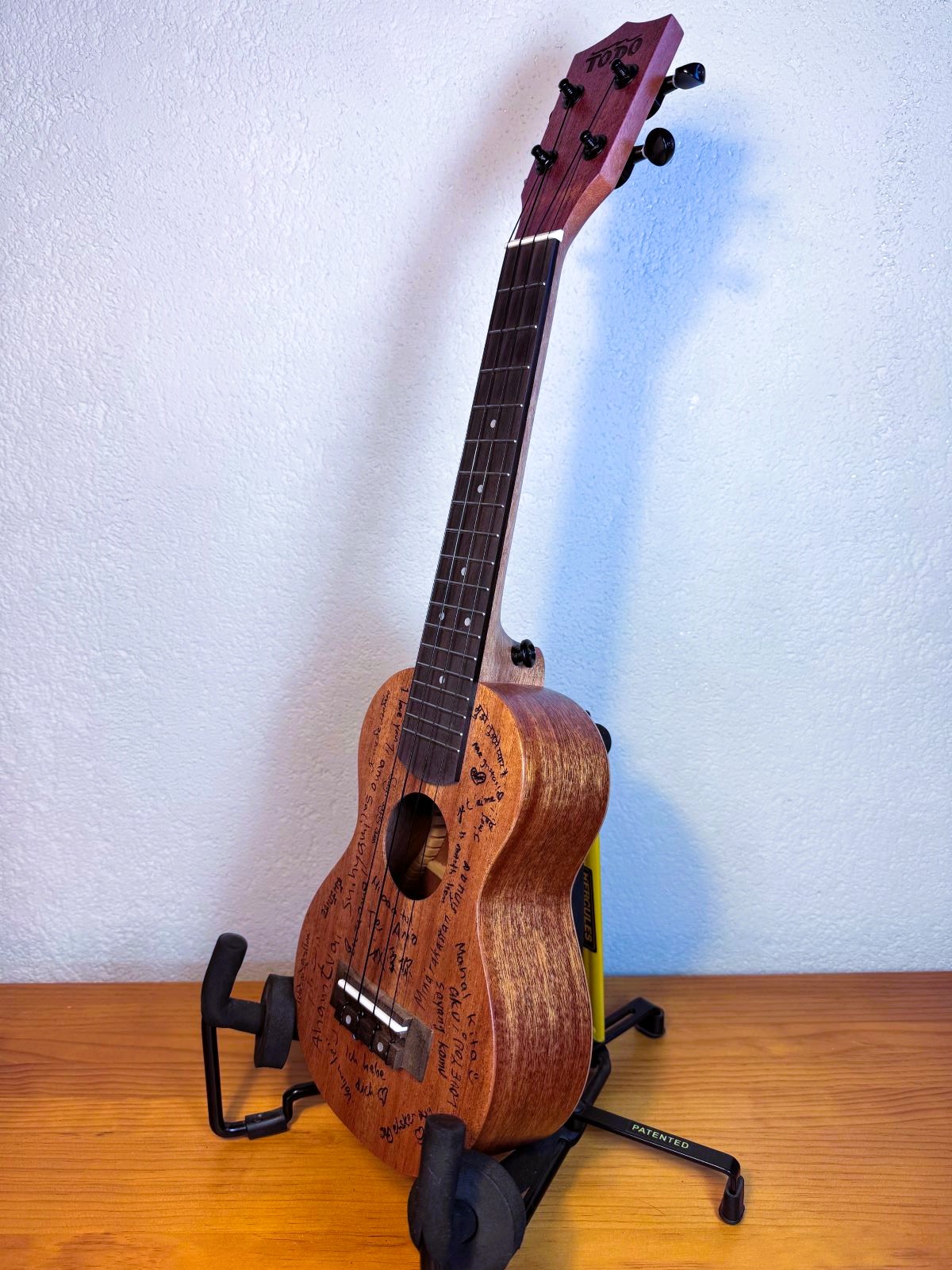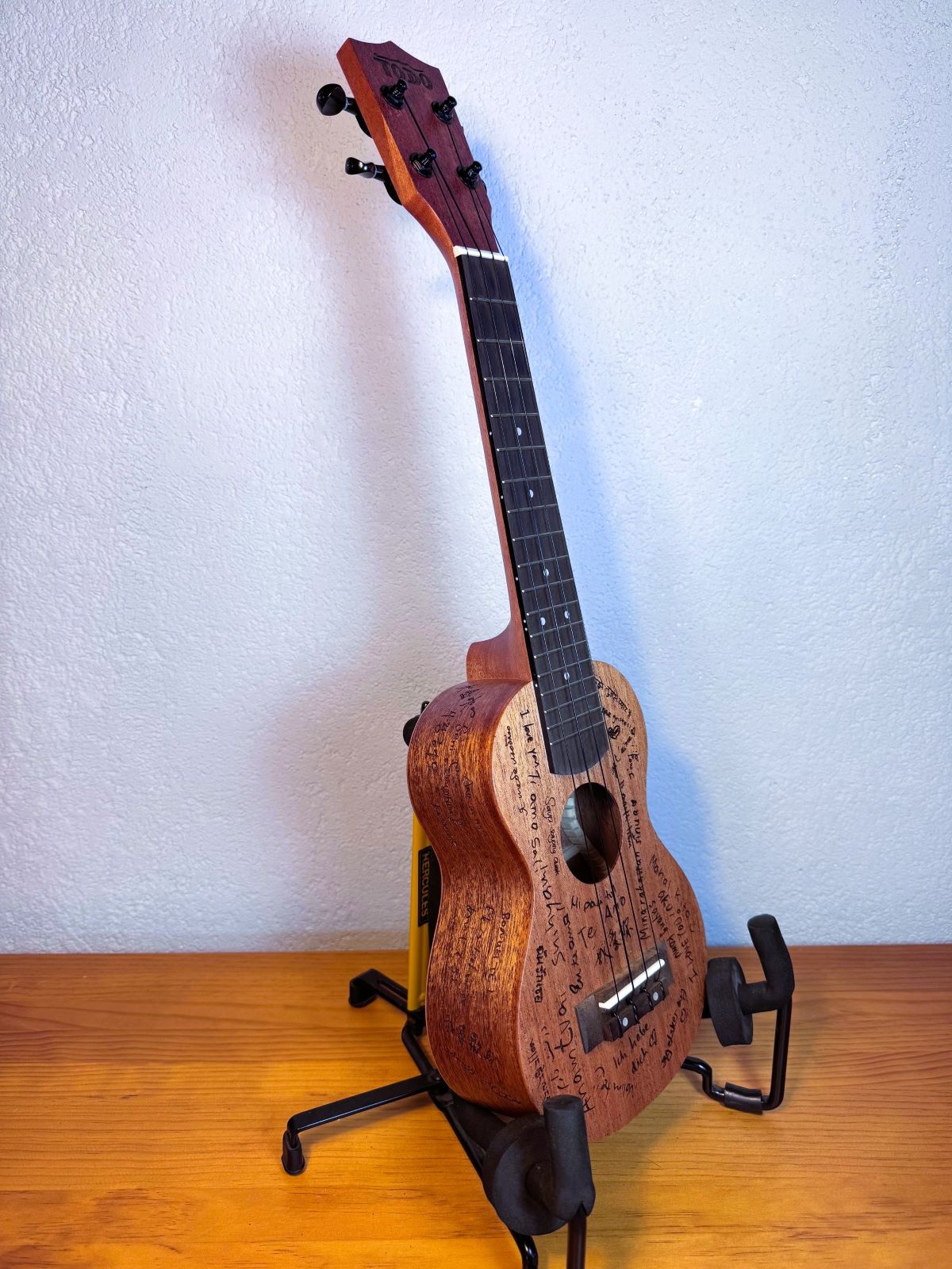 Verschiedene Länder - Verschiedene Sprachen - Verschiedene Kulturen - EINE WELT. Die Love-Ukulele hat ein ganz besonderes Design - auf ihr ist "Ich liebe dich" in 26 verschiedenen Sprachen eingraviert. Jede Garvur steht für eine andere Liebesgeschichte welche die Grenzen dieser Welt überwinden.